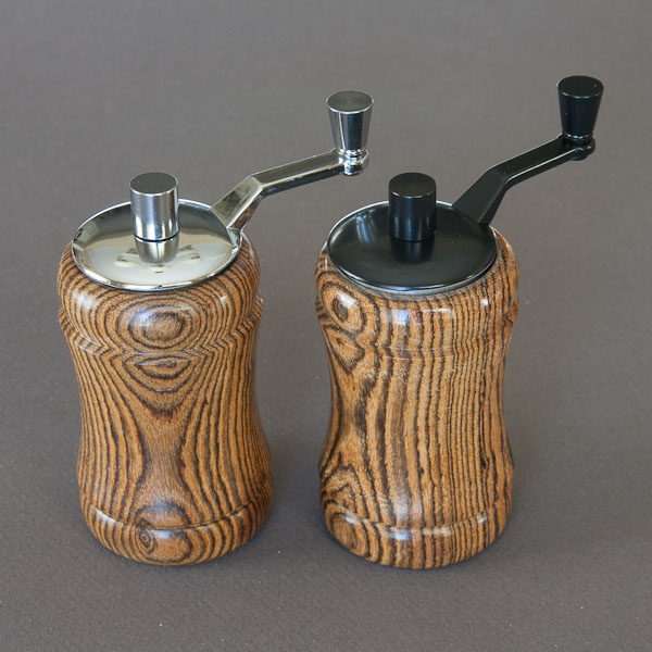 These salt and peppermills are perfect for the dinner or picnic table. The smooth twist handle and high quality ceramic grinding mechanism make for easy grinding of salt or pepper. Black enamel for the pepper and chrome for the salt. Shown in bocote.
